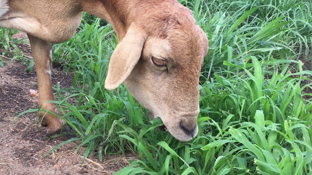 Lammie enjoying a healthy lunch of grass outside at HERD earier this year in January 2020.