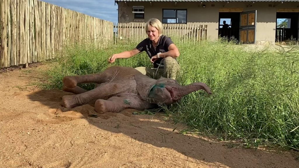 A tender moment between Adine and Khanyisa on 13 February 2020, as Adine comforts Khanyisa, the orphaned albino baby elephant, with sand tickles outside at HERD.